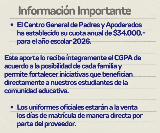 El Centro General de Padres y Apoderados ha establecido una cuota anual de $34.000 para el año escolar 2026. Este aporte es recibido íntegramente por el CGPA, de acuerdo con la posibilidad de cada familia, y permite fortalecer iniciativas que benefician directamente a los estudiantes y a la comunidad educativa.