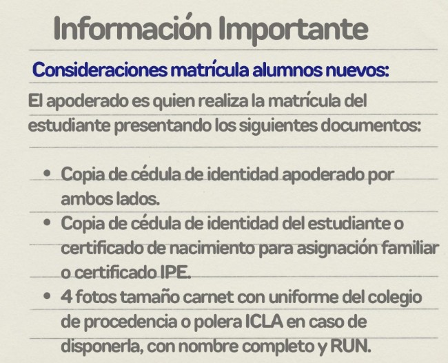 - Cuatro fotografías tamaño carnet del estudiante, con uniforme del colegio de procedencia o polera ICLA en caso de disponerla, indicando nombre completo y RUN.